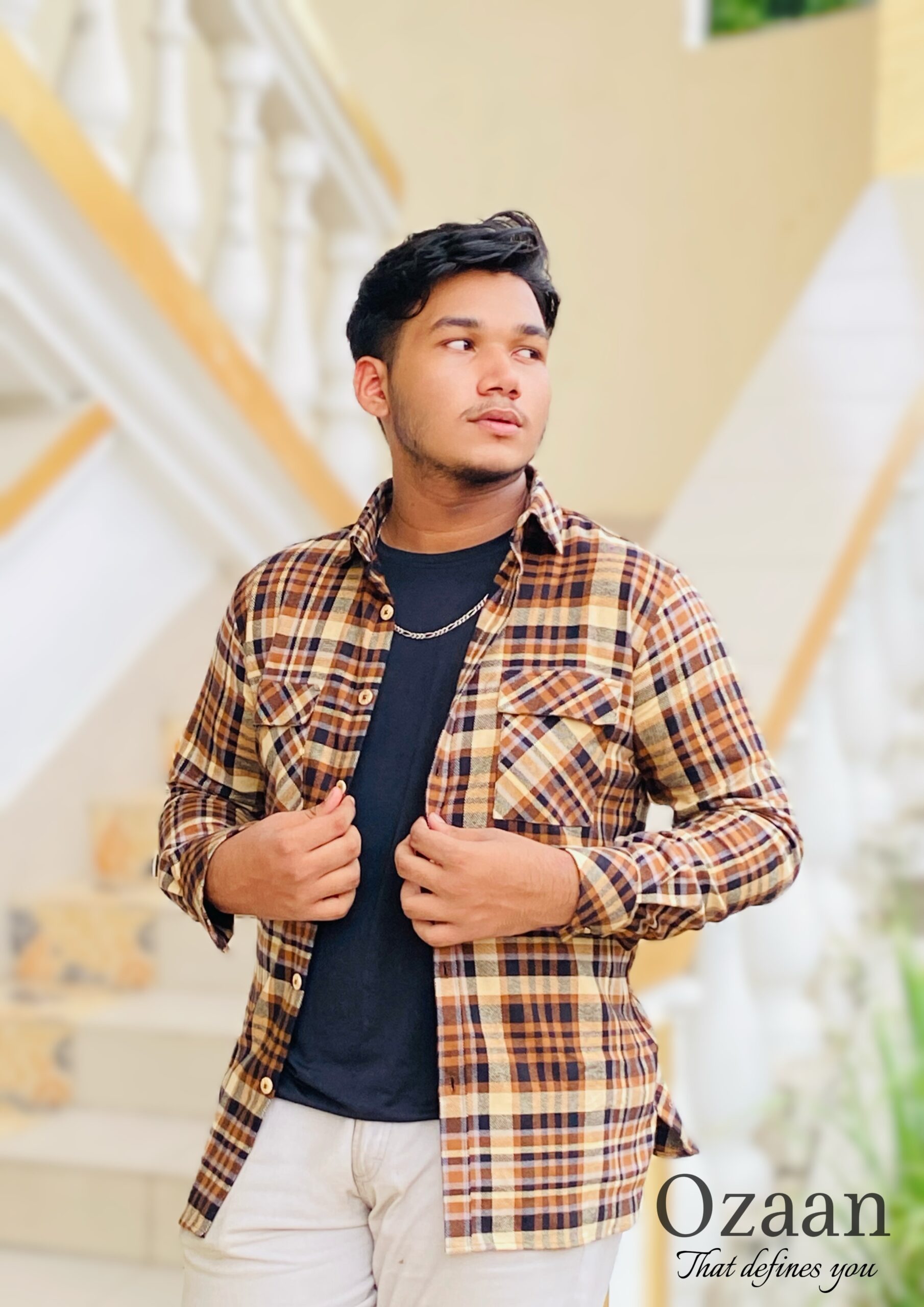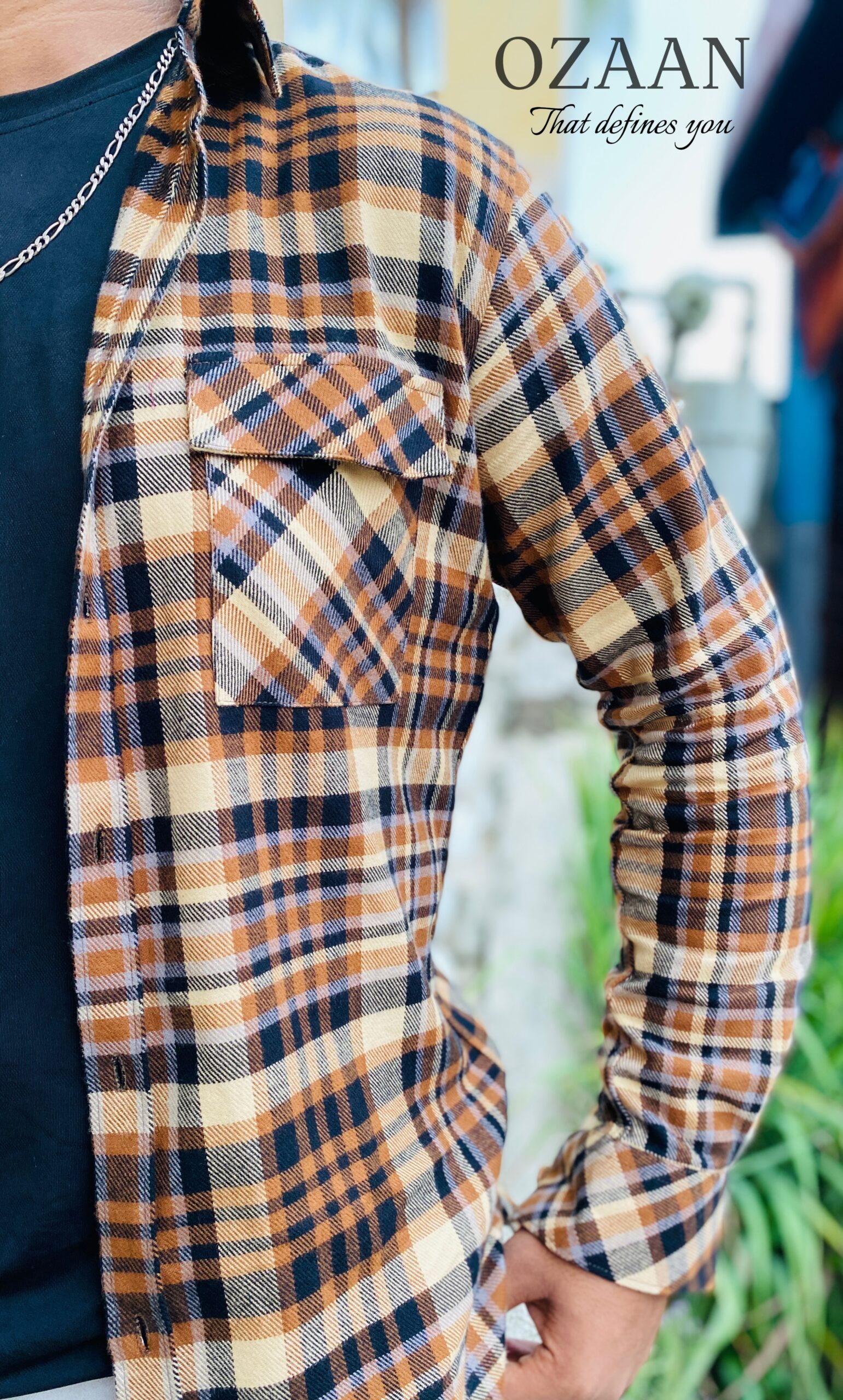 OZAAN Plaid Flannel Overshirt is your ultimate layering essential. Crafted from premium, heavy-weight cotton for warmth and durability, it features dual chest pockets and a timeless earth-tone check pattern. Perfect for casual outings, it offers a relaxed fit that pairs effortlessly with tees and denim.
